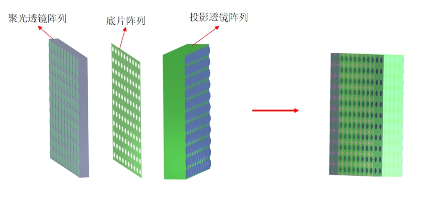 利用 OAS 软件的阵列建模功能,精准构建三阵列核心结构:将聚光透镜阵列设为六边形单元排布,输入曲率半径、厚度等关键参数;底片阵列定义为带品牌标识的光线遮挡元件,投影透镜阵列采用低色散光学玻璃。通过软件内置材料库调用光学常数数据,同步设置温度系数参数以模拟环境影响。