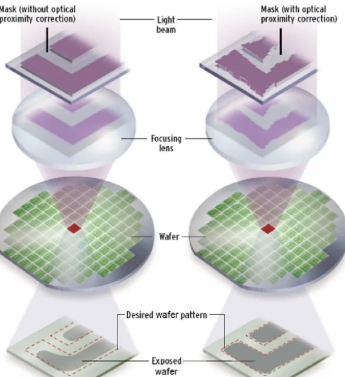 OPC的核心工作原理是通过对掩模版布局的精准调整,补偿光刻过程中光线的非理想传播特性。其核心逻辑为“偏差预测-反向修正”:借助专业软件计算仿真,提前预判光刻曝光后晶圆上可能出现的图形偏差,再根据预判结果对原始掩模图形进行反向修正,最终使晶圆上的实际成像结果尽可能贴合设计目标。