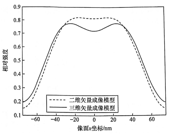 差异结果:二维与三维模型空间像相对强度分布差异在10-2量级,最大绝对差值9.3x10-2、平均绝对值差4.5x10-2、差值均方根5.1x10-2。