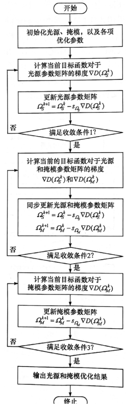 • 目标函数梯度:目标函数对光源、掩模参数矩阵的梯度,由“像质评价函数梯度”与“各罚函数梯度”加权组合而成,是参数更新的核心依据;