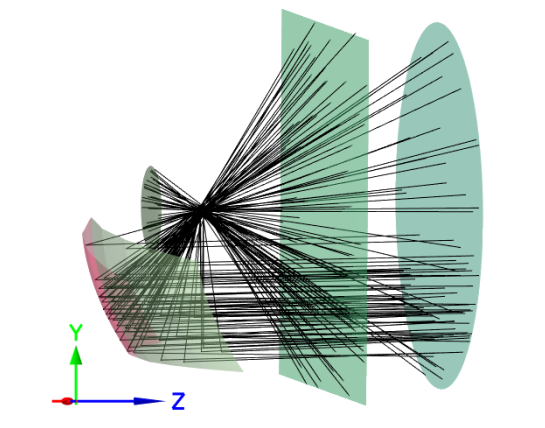 利用 OAS 软件的光线追迹算法,对初始设计方案进行模拟分析,识别光线散射严重的区域及眩光风险点;通过迭代调整反射面的分段曲面方程,优化光线反射路径,提升核心照射区域的照度均匀性,同时削减杂散光。