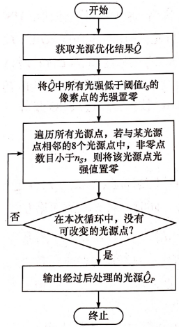 像素化SMO技术能够对每个光源点的光强进行优化,虽然具有较高的优化自由度,但也会导致光源图形较为复杂。研究表明,当光源的光瞳填充率过大时会减小光刻PW。为了进一步提高PW并降低光源复杂度,我们提出一种光源后处理法。光源后处理法流程图如图所示。