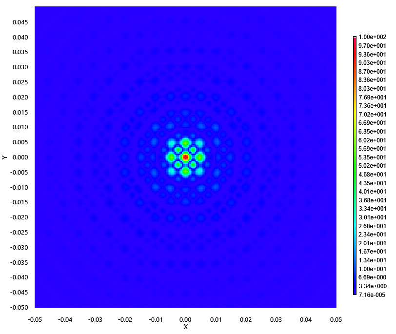 在本案例中,软件对五个光束光源发出的光线进行了全面且精确的追迹,详细计算了光线在经过理想透镜过程中的折射情况,以及光线到达探测平面时的相位和振幅信息。基于光波的叠加原理,软件对各光束在探测平面上的相位和振幅进行合成,从而精准模拟出多结构干涉所产生的复杂干涉图样,为后续的分析提供了直观且准确的可视化结果。