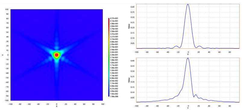 使用OAS的衍射仿真功能,基于基尔霍夫衍射理论计算三角孔径的远场衍射过程,输出衍射图样与光强分布曲线。结果显示:远场衍射图样呈中心对称分布,中央主极大光斑为三角形轮廓,周围环绕 3 组明暗交替的衍射条纹,条纹间距随衍射角增大而减小。